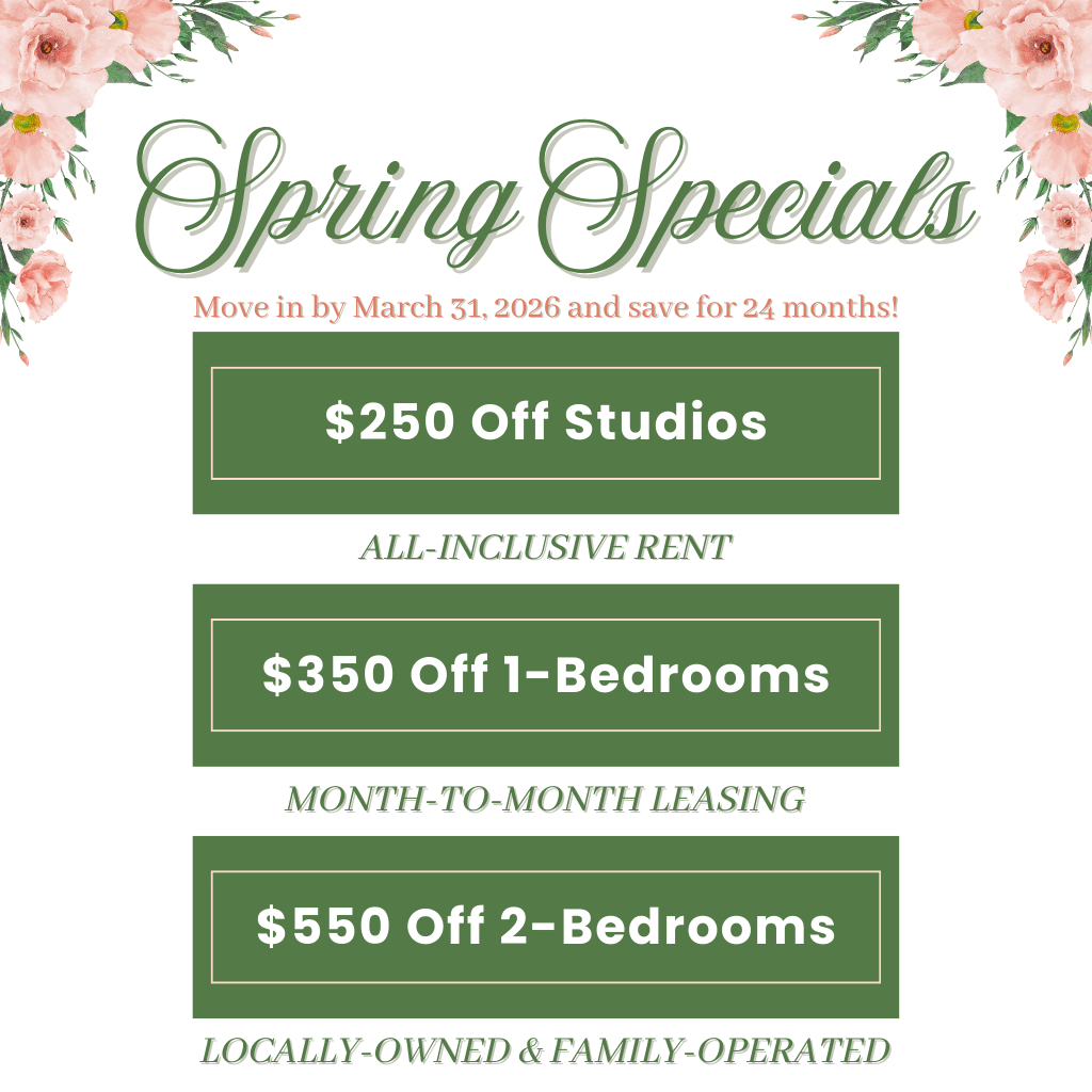 Spring Specials!  New residents can take advantage of our limited-time Move-In Specials when you move in by March 31, 2026: $250 off studios, $350 off one-bedroom apartments, or $550 off two-bedroom apartments for 24 months. We also offer a 10-year rate lock as a move-in special. And with our month-to-month leases, there are no long-term commitments.