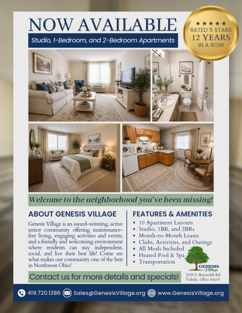 Our new resident specials change seasonally and are available for a limited time. If you or your loved one is considering living at Genesis Village, there’s never been a better time to explore our community.